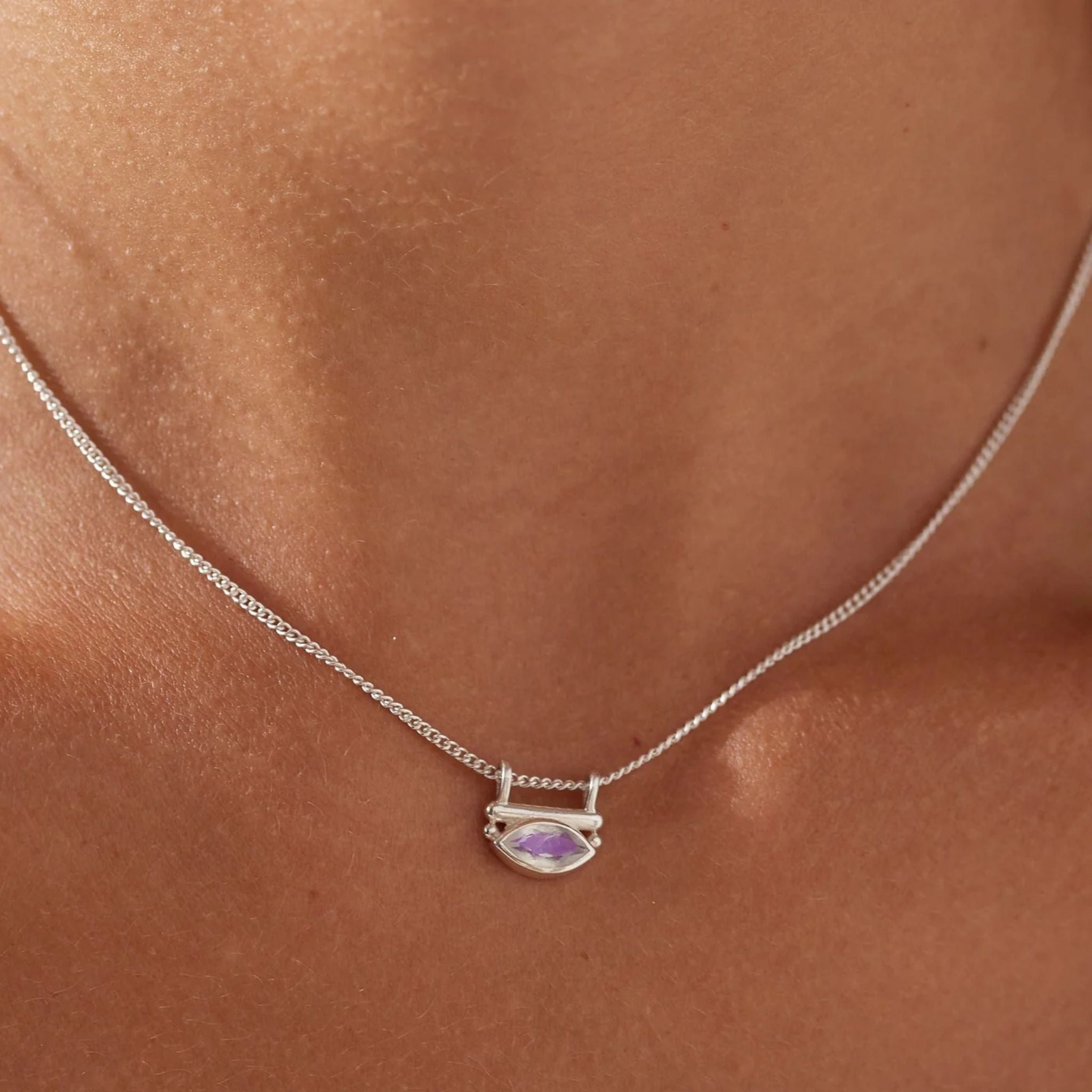 The pendant is on a 40cm plain curb chain and is available in 4 stone colour ways, Apatite, Moonstone, Rhdolite and Iolite.