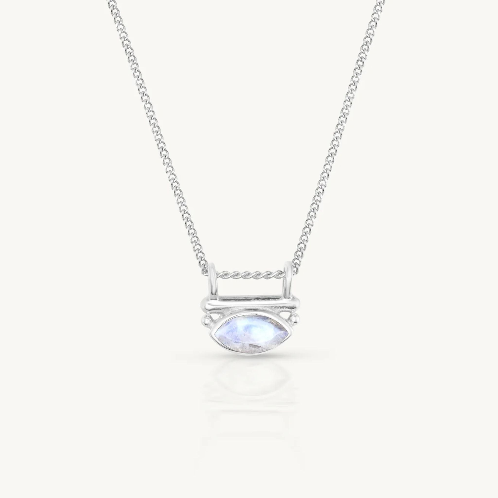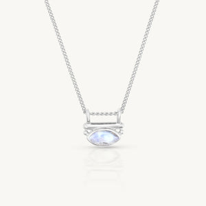 The Nyra Necklace is a necklace adaptation of our best selling Nyra stacking band. This stunning necklace features a stunning hand cut marquise stone bezel set in a bar style setting that anchors to the chain at two points.