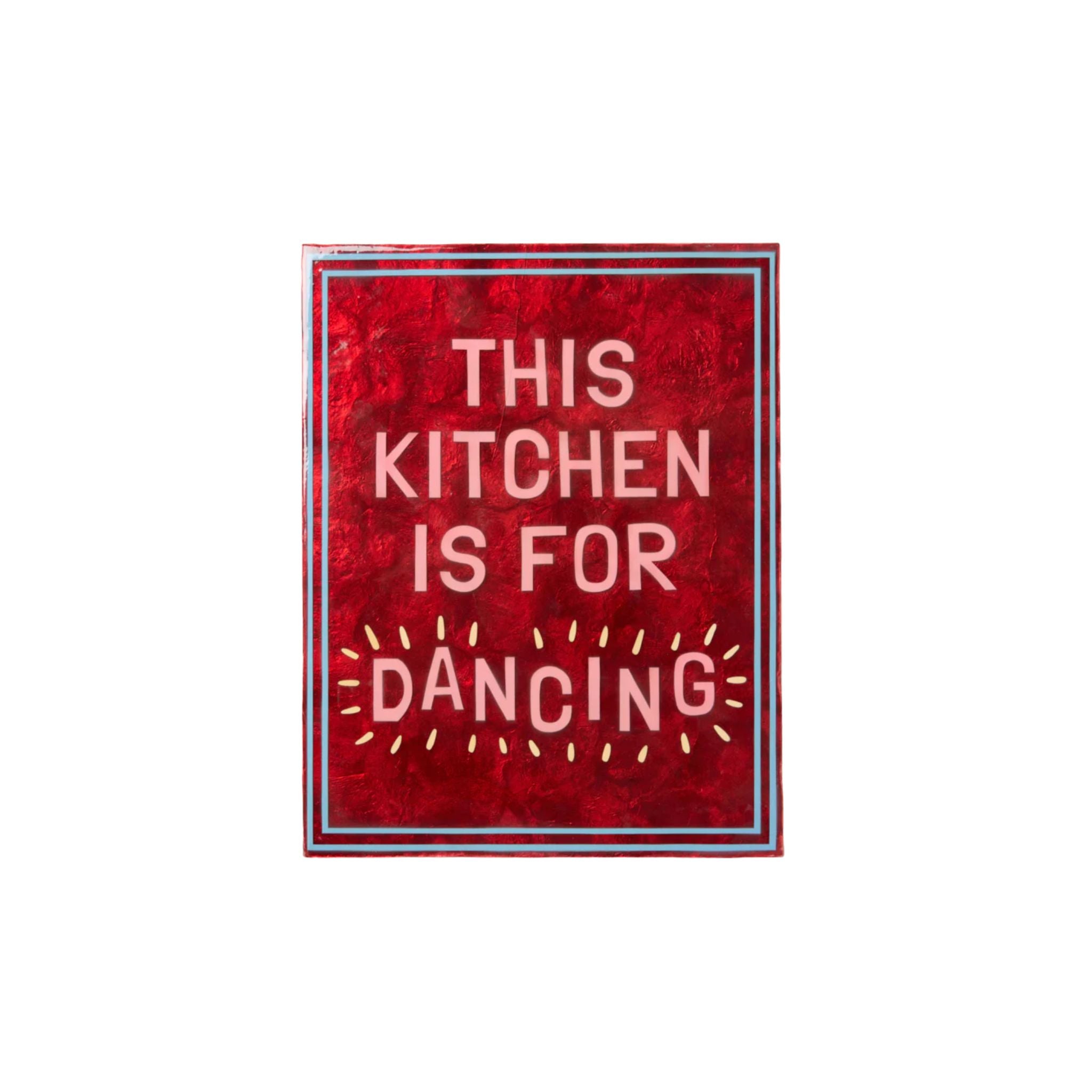 Go big on the boogie. Our large kitchen dancing wall tile is made from handpainted capiz shell in a deep berry hue with playful pink text, because every good dinner starts with a shimmy as does every clean up. Makes a statement, sets the tone.