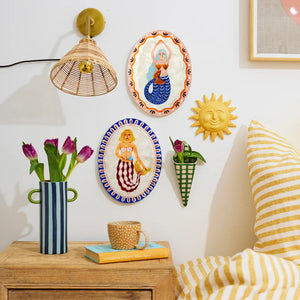 Our Mermaid Coral Cowrie Wall Art marries luminous Capiz shell with hand-painted folk imagery, where this golden-haired siren with burgundy scales emerges from her translucent oval canvas.