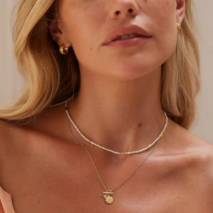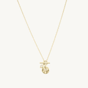 Featuring a front toggle design, this piece showcases a round organic pendant etched with a radiant starburst and set with White Topaz. A second bezel-set White Topaz, delicately suspended beside the pendant, adds an extra touch of light.