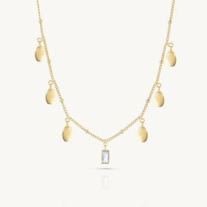 The Petal Necklace is a short necklace perfect for layering that features a baguette cut moonstone charm in it's very centre with 3 small petal charms on either side.