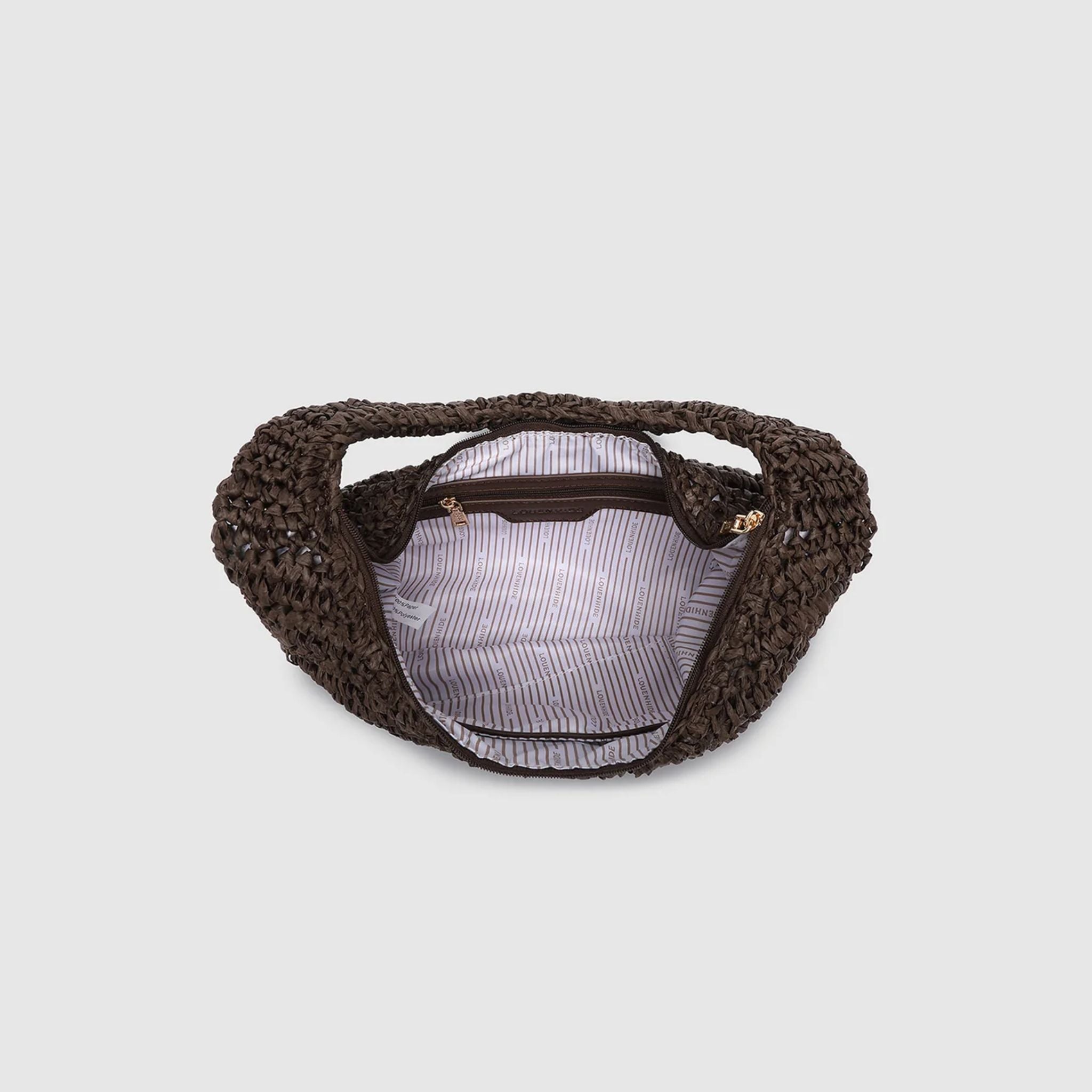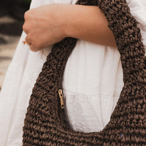 The Nellie Raffia Shoulder Bag captures the carefree charm of a coastal summer, blending natural texture with refined design. This lightweight woven handbag is crafted from dark, natural raffia in a softly sculpted crescent silhouette - made for breezy days and golden hour strolls. Light gold hardware adds a polished finish, while a secure zip closure keeps your essentials safe from brunch to beach club. Designed to sit comfortably under the arm, this raffia handbag brings a touch of laid-back luxury to any look. Whether paired with a linen set or a flowing sundress, Nellie Raffia is the perfect companion for long lunches, market mornings, and everything in between.