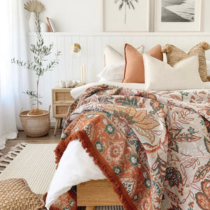 The warm bohemian design of our Willow picnic rug features earthy tones set against a sandy backdrop. Creams, browns and green are delicately woven with 100% cotton creating a durable, soft picnic throw. The Willow is the perfect garden or beach blanket to adorn a picnic with friends and loved ones.