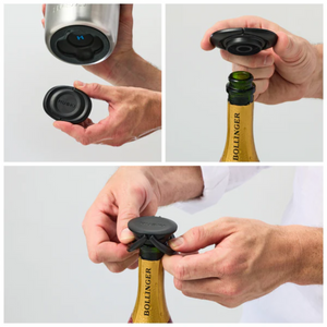 The stopper clips on and seals the top of most Champagne, Prosecco and sparkling wine bottles.
