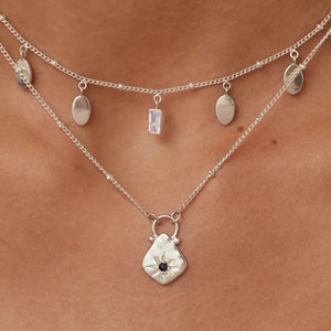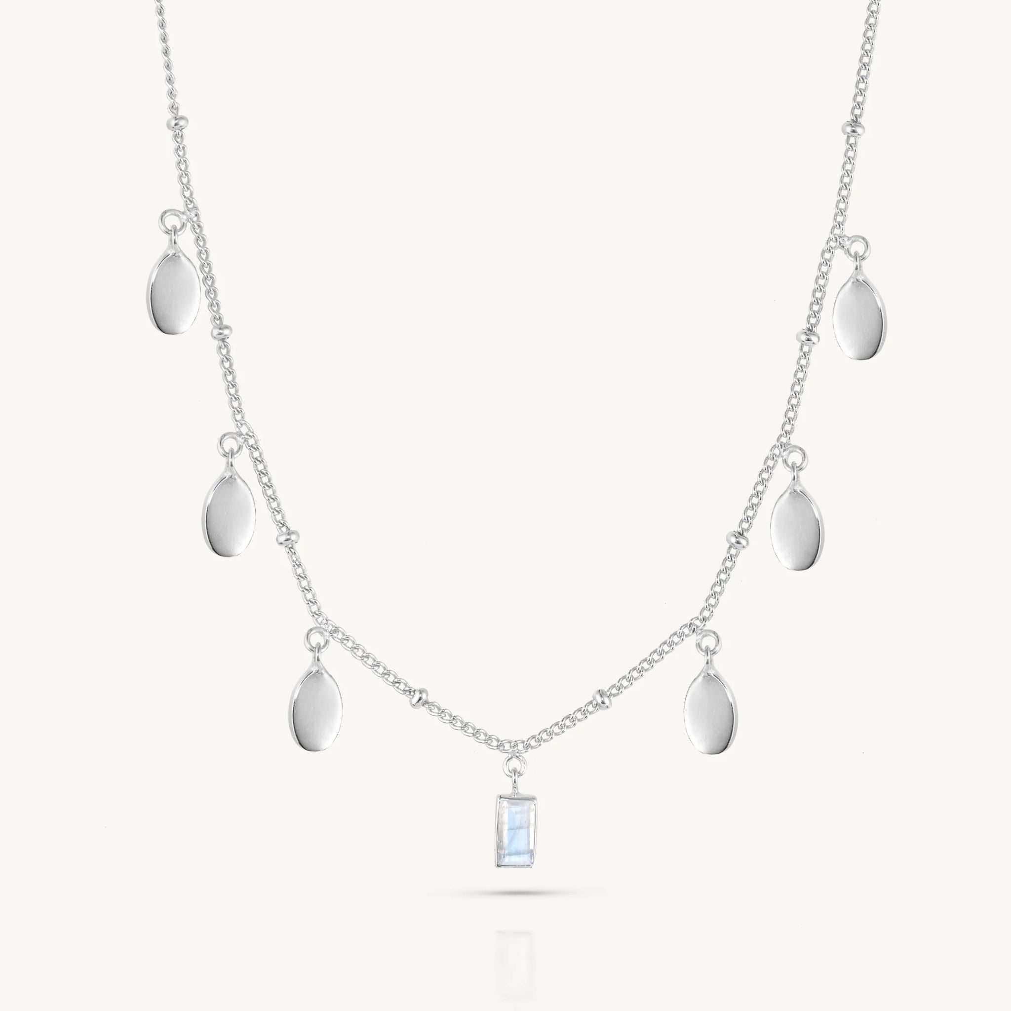 The Petal Necklace is a short necklace perfect for layering that features a baguette cut moonstone charm in it's very centre with 3 small petal charms on either side.