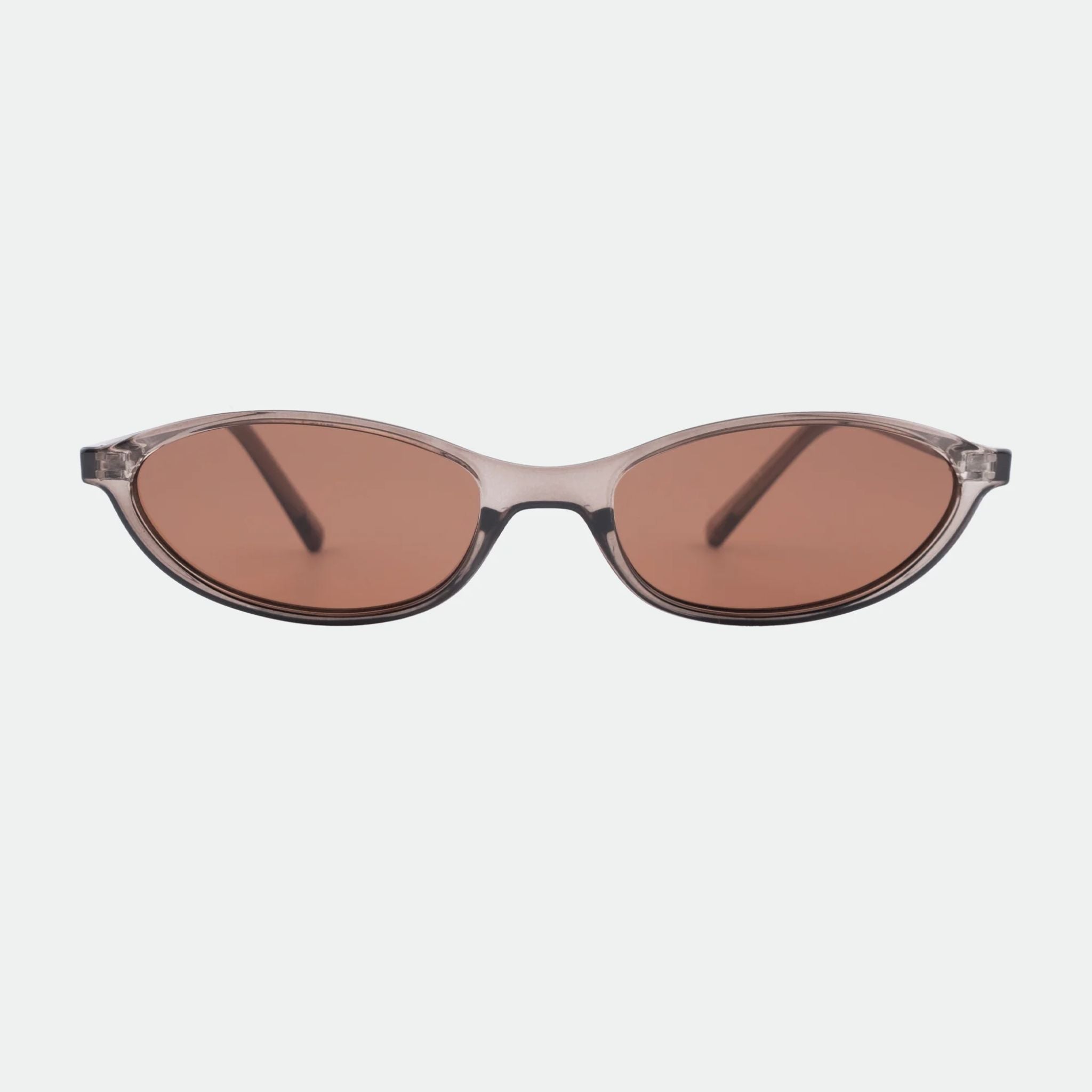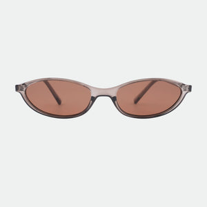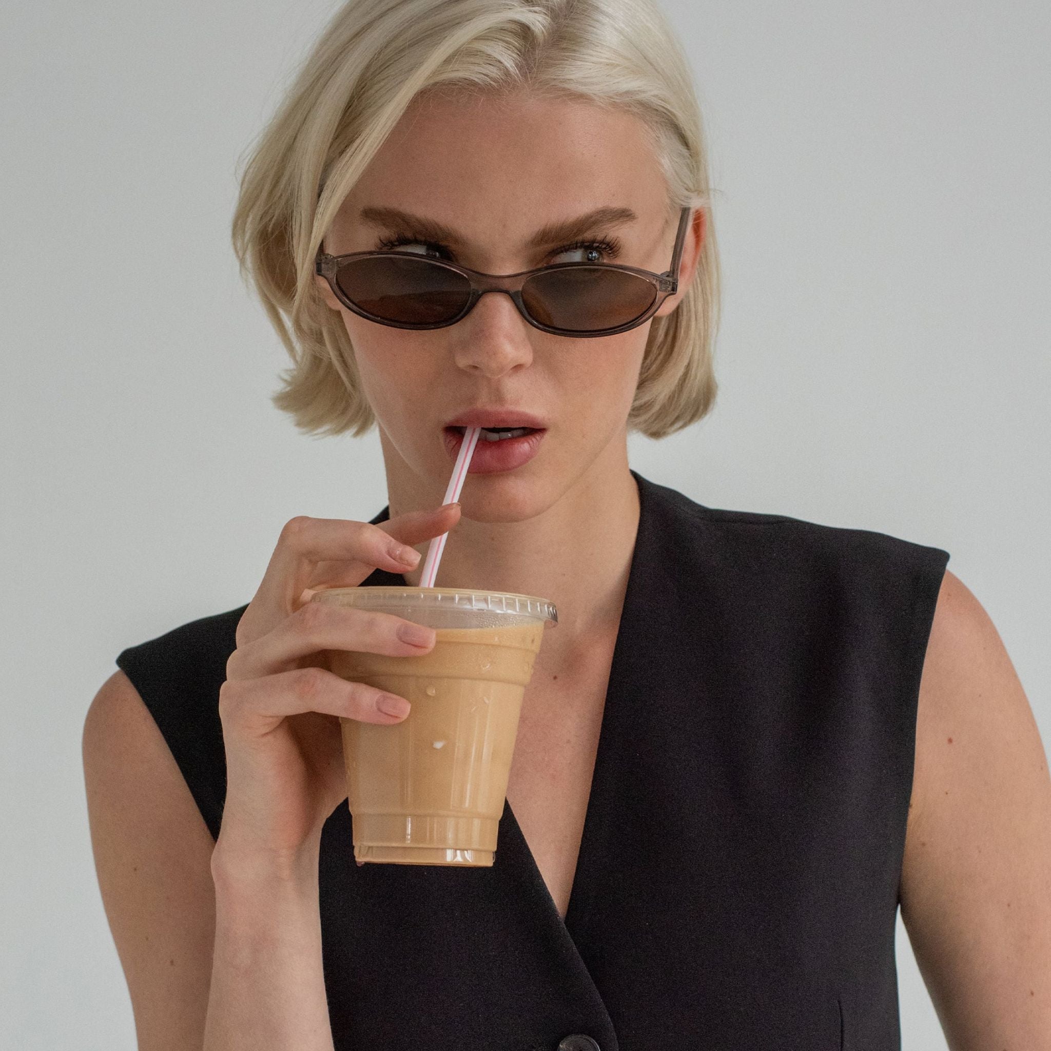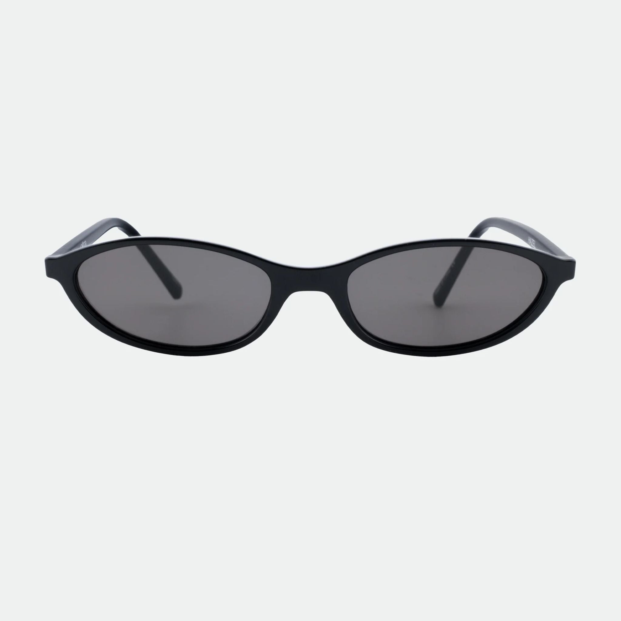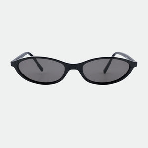 Hazel is a rounded, thin cat-eye silhouette in polished black, offering a sleek balance of classic elegance and modern edge. Paired with smoke lenses.
