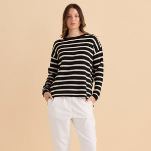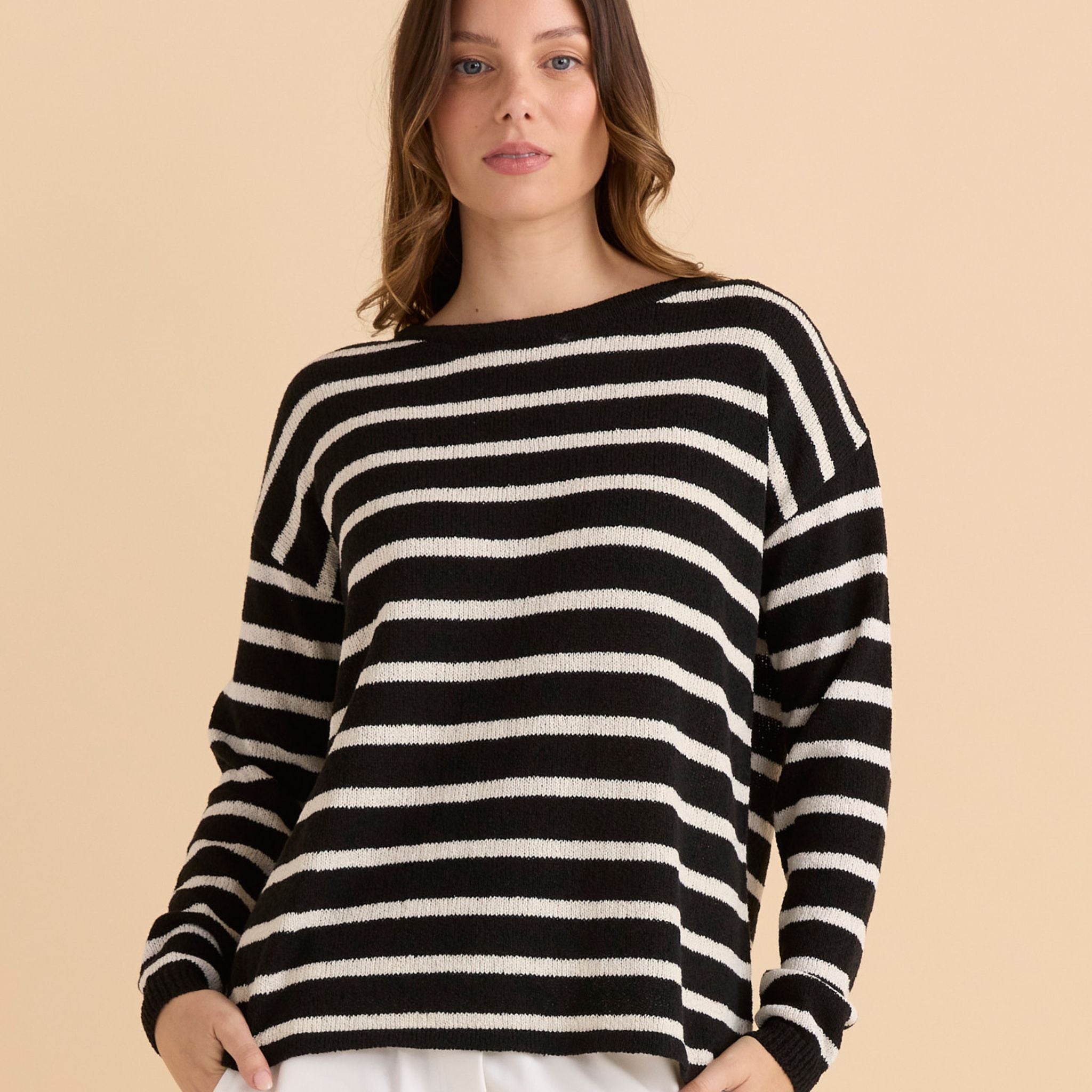 Meet your new layering favourite—the Bradford Knit Top by Betty Basics. This beautifully soft, lightweight piece features a textured knit in timeless yarn-dyed black and white stripes. With its relaxed dropped shoulders and slouchy fit, it's designed to feel as good as it looks. Throw it on over a dress, pair it with your favourite jeans or shorts, or style it with a skirt for effortless versatility. Perfect for those cooler days and evenings when you need that extra layer of comfort and style.
