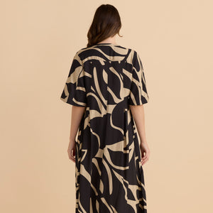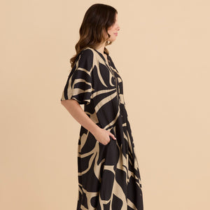 The button through front and gentle collar detail add a touch of structure, while the wide sleeves and roomy fit create that beautiful throw on and go feel we all love. Side pockets make it practical for everyday wear and the monochrome floral print brings a bold yet timeless edge that works from weekday errands to weekend plans.