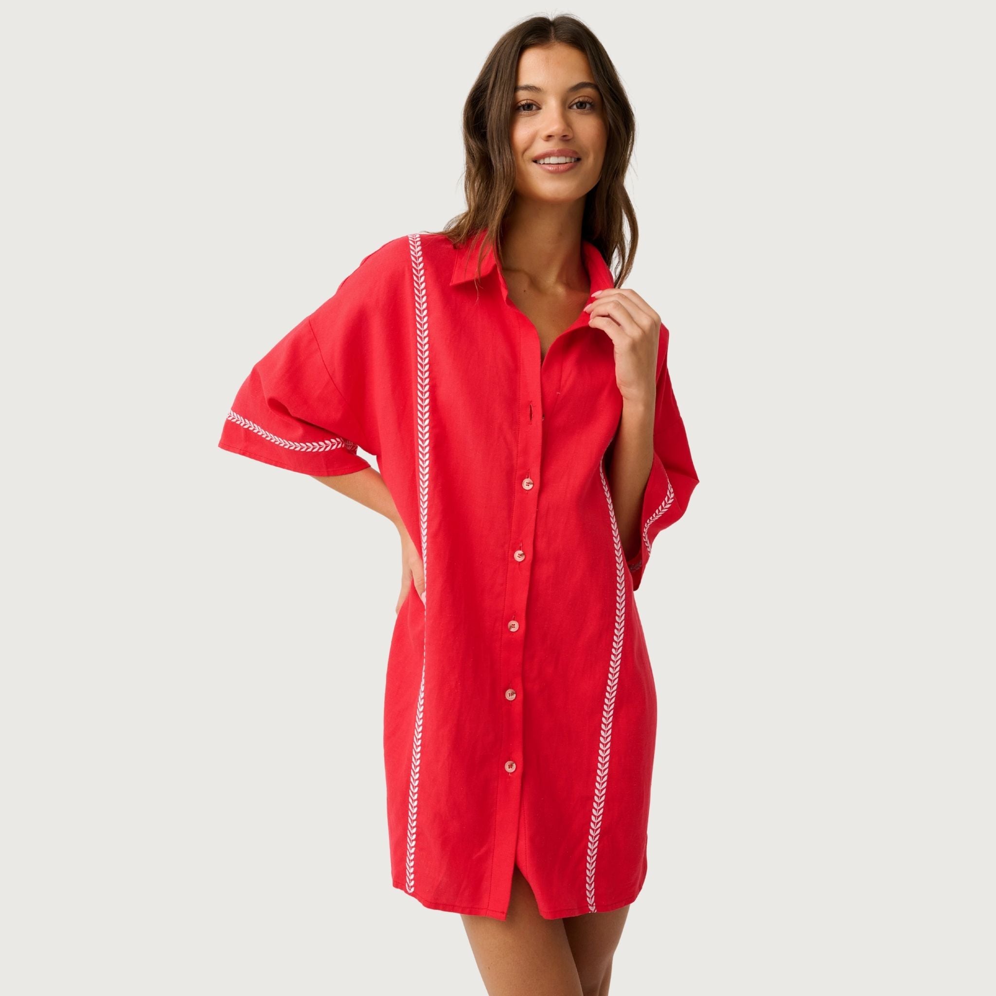 The Casey Shirt Dress combines effortless style with versatile everyday wear. This mini length design features a flattering straight fit and relaxed drop shoulders with elbow-length sleeves for a contemporary silhouette. The V-neck neckline and functional front buttons offer easy styling and layering options. Delicate white leaf embroidery adorns the front and sleeve hems, adding a refined botanical touch that elevates the piece from casual to polished.