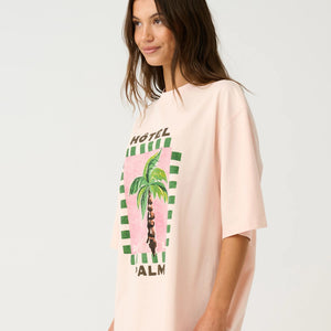 The Hotel Palm Jeana Tee brings effortless style to your everyday wardrobe. Cut in a relaxed boxy fit with a straight hemline, this short sleeve tee features a striking Hotel De La Palm graphic across the front. Crafted from 100% cotton jersey, it's breathable and comfortable for all day wear. Part of the Hotel De La Palm Resort 2025 collection, it's the perfect piece for a laid back, resort inspired look.