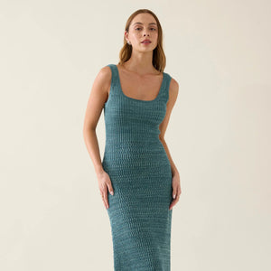 A textural pointelle-knit dress crafted from 100% cotton. This 7/8-length dress features mixed two-tone woven fibres for visual depth, a rounded neckline, and a softly flared mermaid-style hem. This dress offers subtle glimpses of skin.