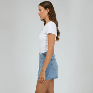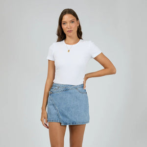 Get ready to turn heads with our Leni Mini Skort, designed for both style and functionality. Featuring a chic wrap detail, this skort offers the perfect blend of a flirty mini skirt and the comfort of concealed shorts underneath. Made from high quality denim, it provides a flattering fit and easy movement, making it ideal for any occasion. Pair with a simple tee and some sandals for a fun everyday look!