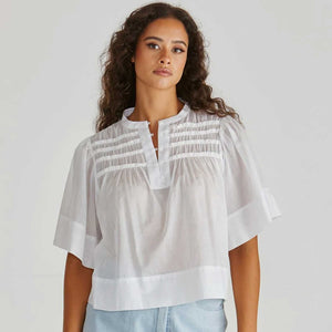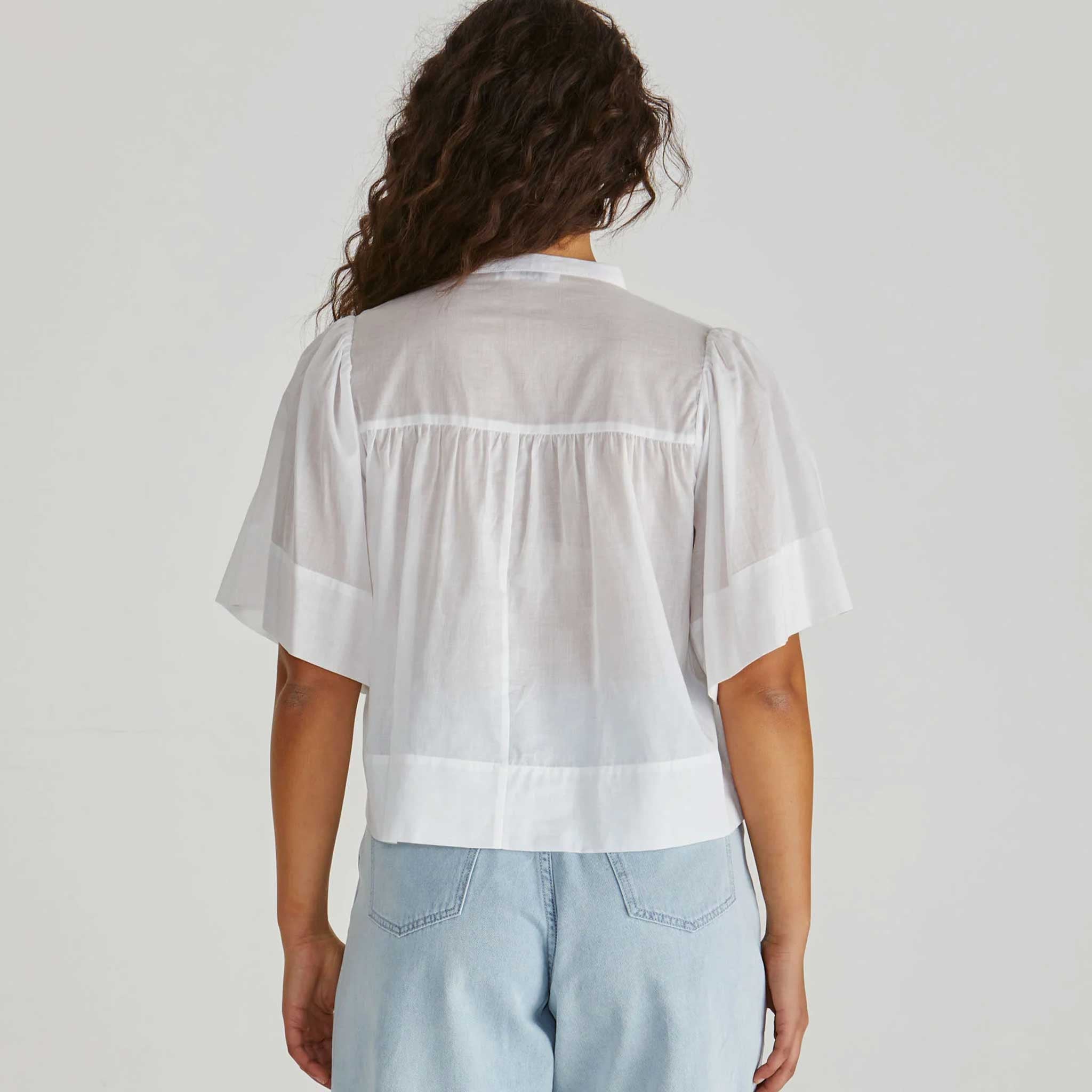The Pammi Blouse adds a touch of vintage-inspired charm. With soft ruffle detailing, a button-up front and wide hem, it’s relaxed yet refined. The kind of top that looks good with everything.