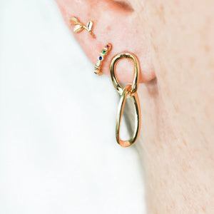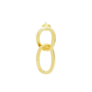 These statement Gold Vermeil earrings feature two golden intertwined hoops, hanging from a stud component. Handcrafted in 925 Silver, finished with a high quality 2.5 Micron thick layer of 18Karat Gold, ensuring the rich gold lustre is retained longer.