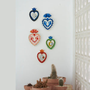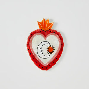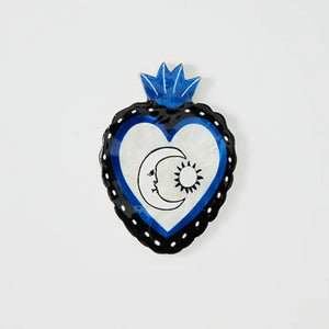 Infuse your space with warmth and celestial charm with the Fuego Moon wall art by Jones & Co. This captivating piece is handcrafted from luminous capiz shell, shaped into a heart, and adorned with a vibrant blaze of fire at the top, inspired by traditional Mexican design. At its center, a delicately hand painted moon and star motif adds a touch of enchantment, making it a unique focal point for any room.
