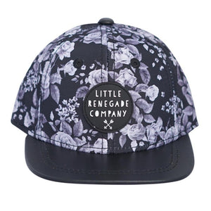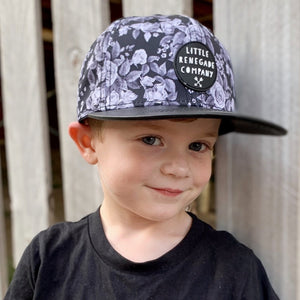 The Midnight Blossom Cap boasts a floral print in shades of grey and white on a bold black background.