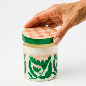 Blush and green checks and florals give this medium Capiz shell box fun feminine sophistication on vanities and shelves. Designed in Sydney and crafted by skilled artisans, each piece celebrates the natural luminosity of the shell through colour and finishing.