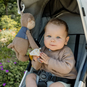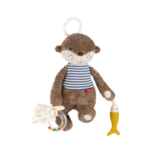The Activity Otter is a playful hanging toy featuring crinkly paper, a rattle ring, and a bell to stimulate curiosity and promote fine motor skills. With soft materials, a muslin cloth, and a fish friend, it encourages grasping, touch, and exploration.