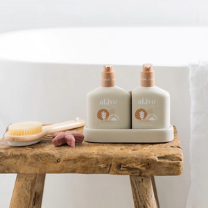 The al.ive baby Hair and Body Duo in Calming Oatmeal contains a Baby Hair and Body Wash and Body Lotion, both housed in a convenient non-slip tray with easy-to-pump lids. The formula is vegan, cruelty-free, and palm oil-free, and contains naturally derived ingredients that are gentle on the skin.