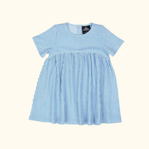 The Candyshop Dress by Animal Crackers, the perfect little dress for your tiny human this summer. Made from a super soft, stretchy textured material, it features a yarn dyed stripe, waist seam with gathered skirt and a snap button closure at the centre back.