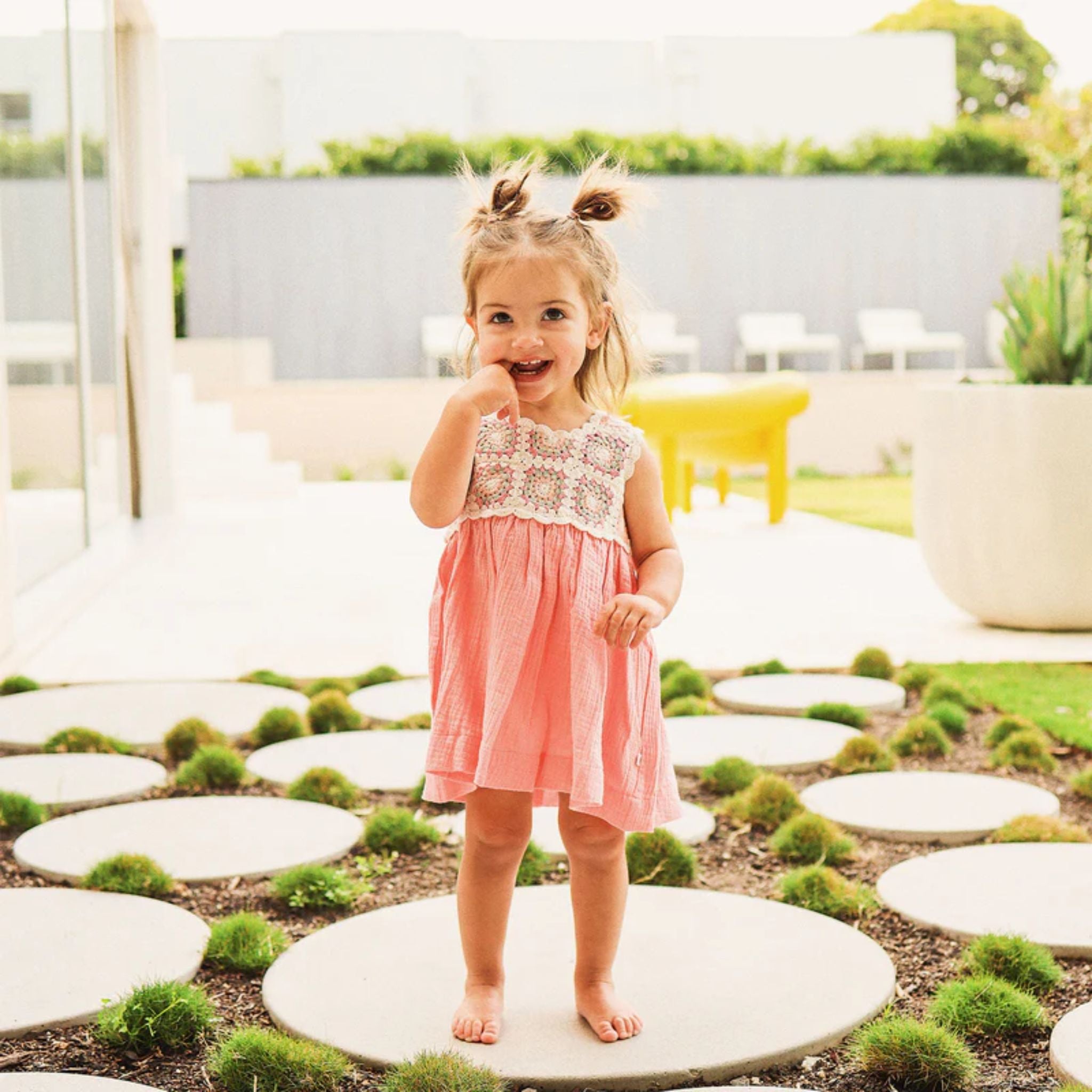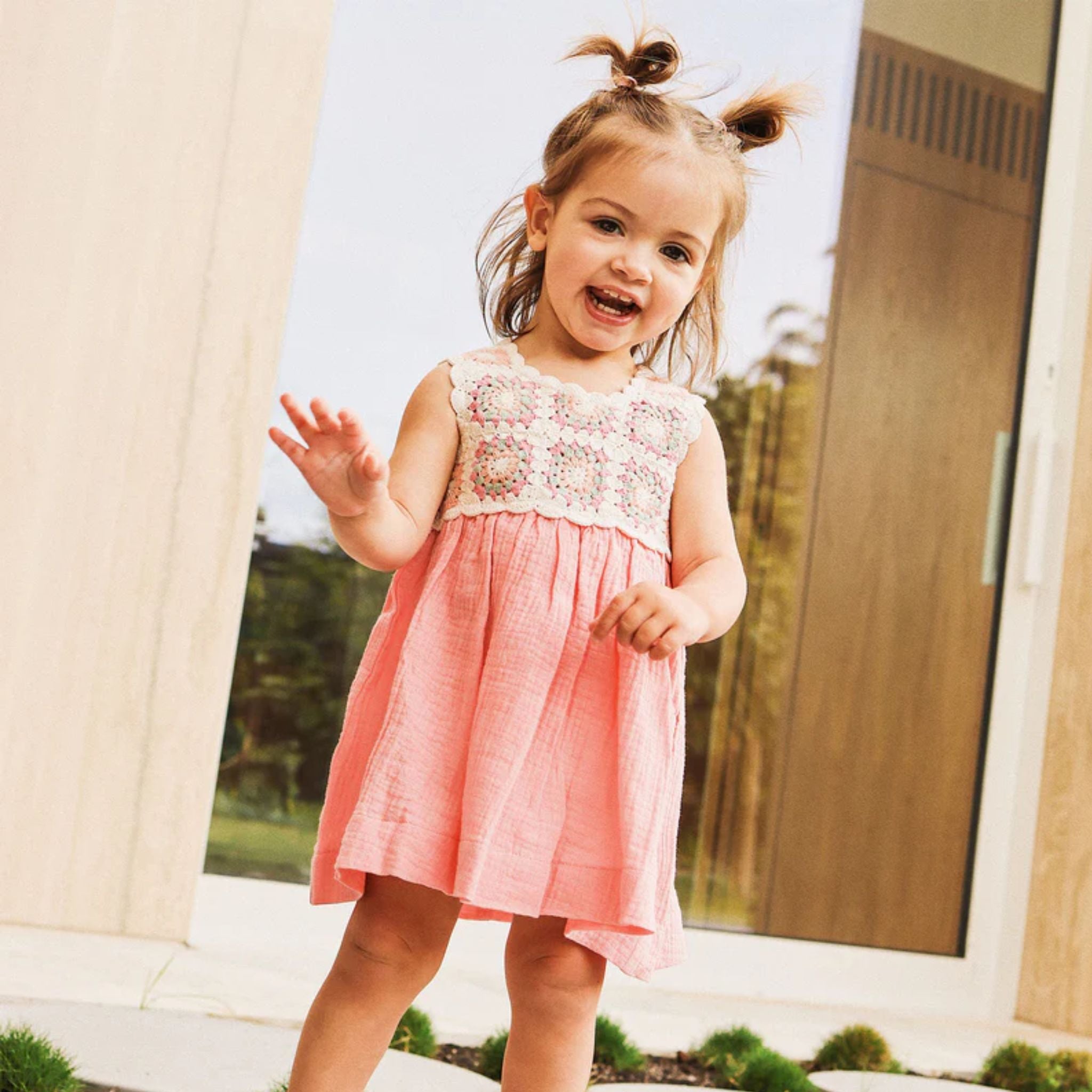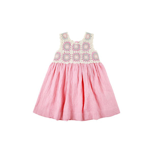 Our Crochet Woven Dress adds a playful twist to timeless summer charm. Featuring a vintage-inspired crochet bodice and a soft pink organic cotton muslin skirt, it’s perfect for sun-filled adventures. Light, breathable, and easy to wear - it's made for twirling, exploring, and everything in between!