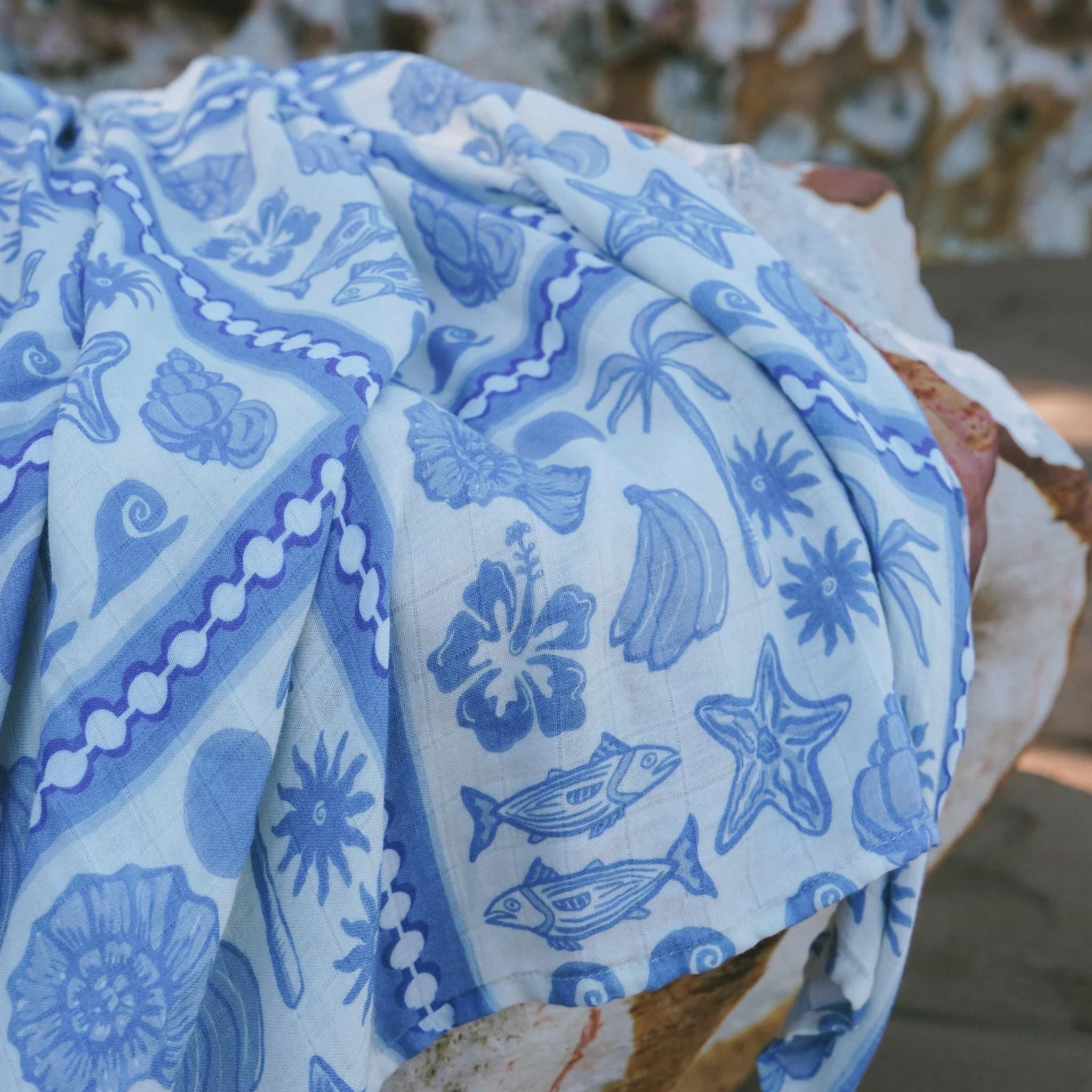 Crafted with exclusive artwork by Laura O’Shannessy, the Big Island Wrap brings artistry and function together in a piece that works beautifully across baby care and everyday life. Whether it's quietly soothing your newborn, shielding a waking tot from sun during stroller walks, or adding effortless style to your summer outfit, this wrap does it all gracefully.