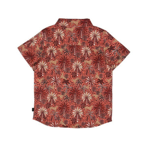 The Native Shirt by Animal Crackers is made from yardage printed cotton material. It features an earth coloured jungle/animal print, wooden buttons down centre front, chest pocket, short sleeves and branded flag and badge.