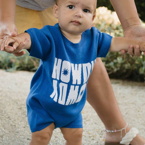 The Arkley Knit Romper is a one piece full of character, crafted in a bold knit with a double “HOWDY” jacquard that celebrates western fun. Soft, breathable, and designed with practicality in mind, it features snap buttons at the shoulder and crotch to make dressing and nappy changes quick and easy.
