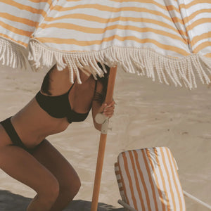 The Sun Ray Beach Umbrella combines thoughtful design, reliable protection, and durable finishes to elevate your outdoor shade experience. With a full 2 m canopy of UPF50+ premium recycled fabric, it offers ample coverage for sunny days at the beach or by the pool. The adjustable timber pole and tilt mechanism let you adapt to shifting sunlight, while fade and water resistant details ensure it endures season after season. Accent touches like wood, tassels, and powder coated hardware deliver on both style and longevity.