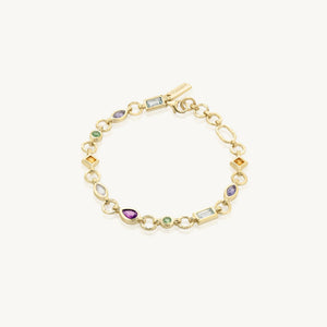 The Calypso Bracelet is a celebration of colour, embracing a kaleidoscope of natural hand cut stones. The Calypso uses Apatite, Iolite, Citrine, Topaz, Moonstone and Rhodolite stones, each with a unique size and shape.