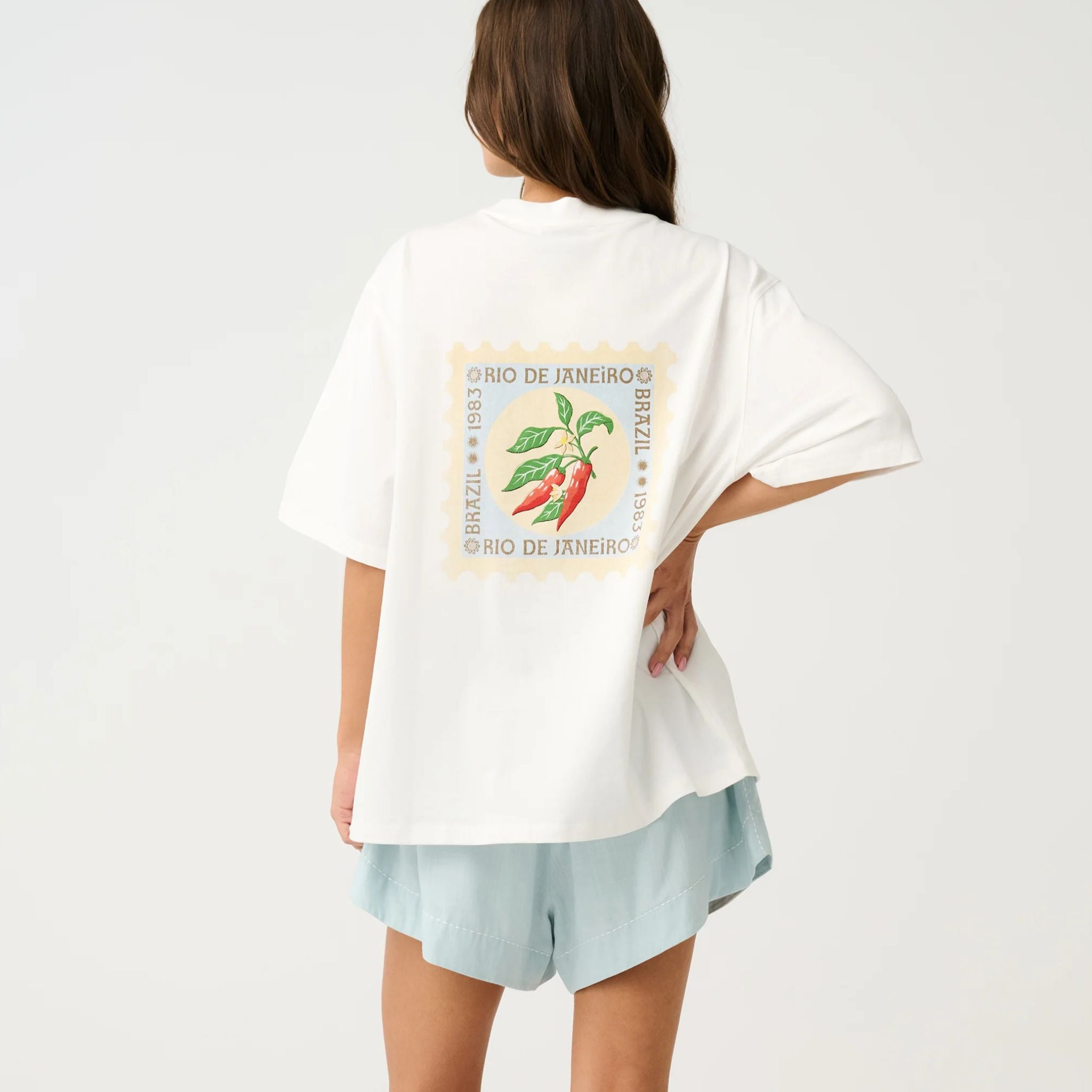 The Rio Chilli Jeana Tee combines relaxed comfort with bold graphic style. This boxy-fit tee features a small chilli graphic on the front chest and an eye-catching large chilli stamp across the back. Cut from soft 100% cotton jersey fabric with a straight hemline and short sleeves, it's perfect for effortless everyday wear. Machine wash cold on a gentle cycle to keep the design vibrant.