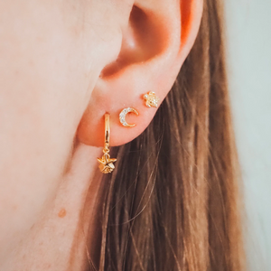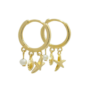 These delicate Gold Vermeil huggies hug the ear lobe, featuring dangling starfish, sea shell and pearl.