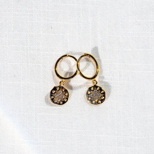 Featuring a delicate huggie earring with dangling circular starburst with fine cubic zirconia detailing. Handcrafted in 925 Silver, finished with a high quality 2.5 Micron thick layer of 18Karat Gold, ensuring the rich gold lustre is retained longer.