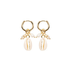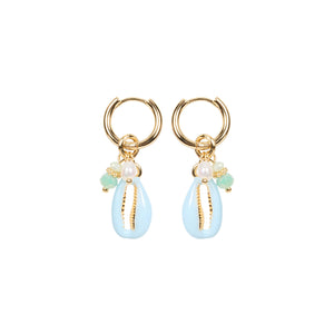 These colour-dipped cowrie shell earrings are finished with dainty pearl and bead charm stacks for a playful finish. A fun way to add texture and tropical vibes.