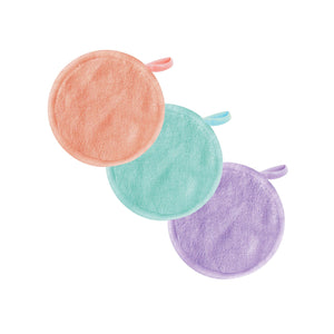 3 reusable facial pads (assorted colours). 12cm. Microfibre. Machine washable.