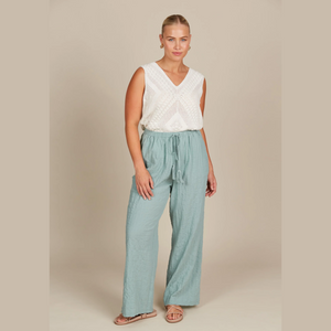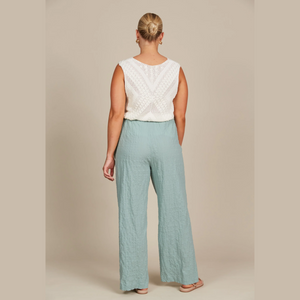 For a lunch date or a chilled lounge session, opt for the Fleur Pant. The textured cotton fabric of these pants boasts a charming crinkle look that adds a lovely contrast when paired with a simple top. Featuring an elastic waist and drawstring, they guarantee a comfortable fit before falling into a straight leg. Style them with a tank or basic t-shirt and slides for a laid-back yet chic look.