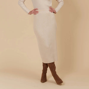 The elastic waistband ensures a comfortable fit, while its versatile design pairs beautifully with a coordinating top, a tailored blouse, or a soft knit. The Juno Knit Skirt is the perfect blend of comfort and sophistication.