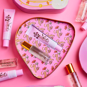 This gift set arrives in the prettiest gifting box you've ever seen and features our Aphrodite Crystal Infused Essential Oil Roller and Berry Blush Lip Balm.
