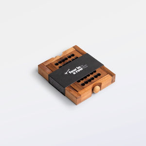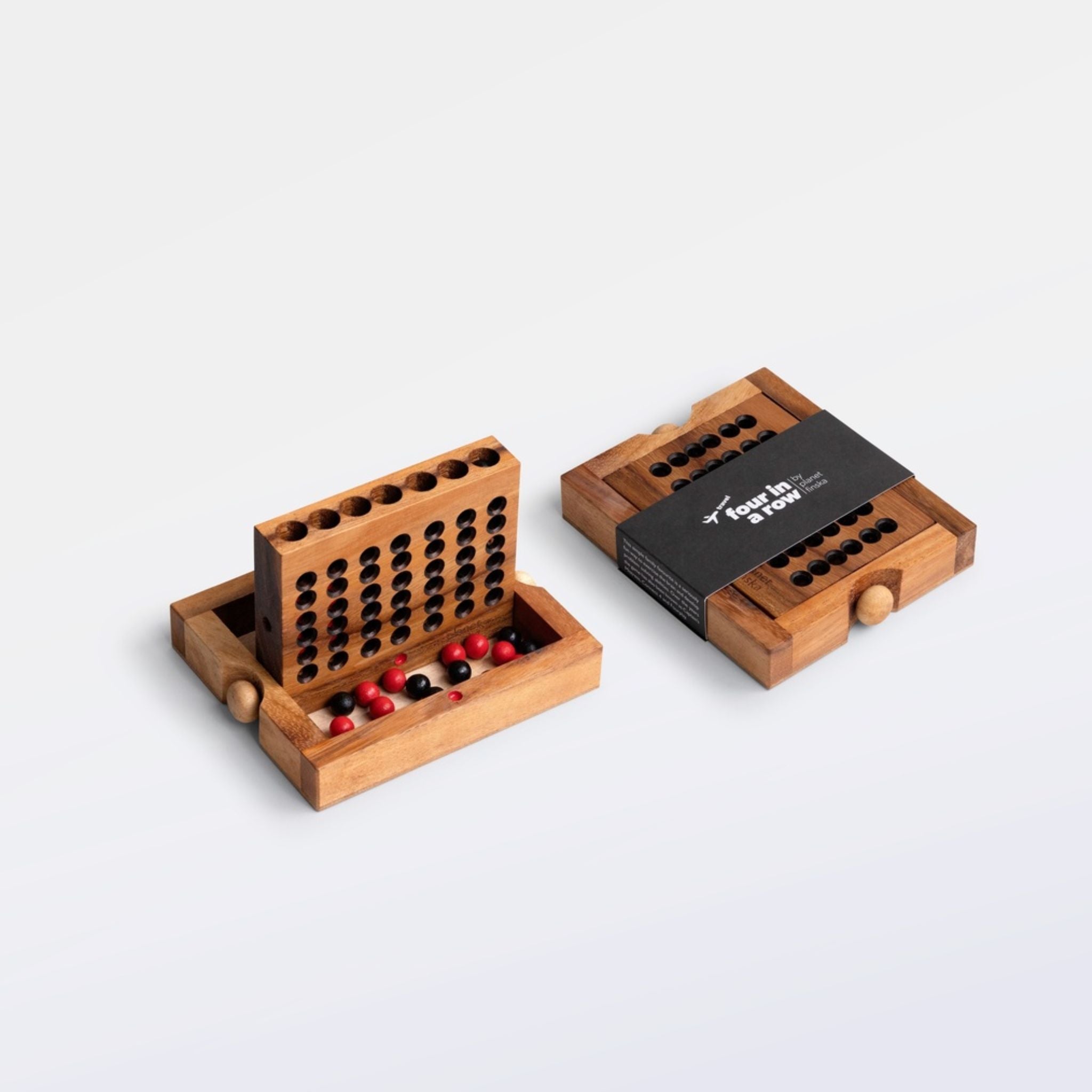 The inside of the game rotates and locks into a vertical position and players take turns to drop cute little painted timber balls down a vertical column. The aim of the game is to beat your opponent to achieve four in a row vertically, horizontally or diagonally.
