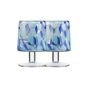 Sky blue and aqua tones blend with bright ocean blues creating a vibrant finish to the Camille glassware range in Marine. The mouth blown, elongated shapes feature a slight upward taper, emphasising the rounded rims of this collection.