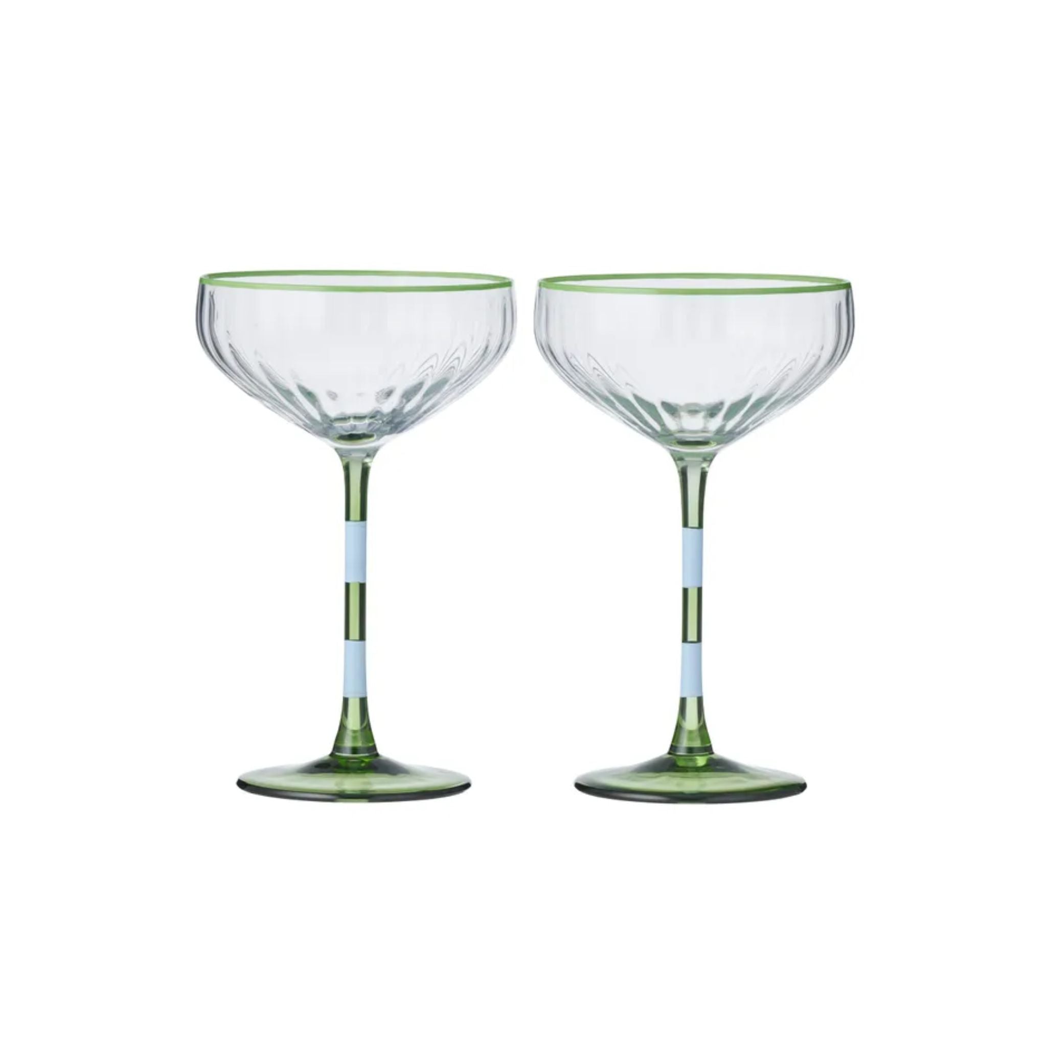 Brighten your table setting with the Lena Coupe Glasses, featuring a charming blend of blue and green glass. Their elegant coupe shape adds a classic touch while the colored glass enhances any occasion with a vibrant, inviting glow.