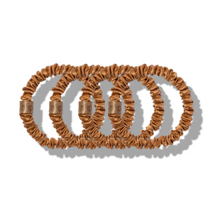 Set of 4 skinny scrunchies. 100% highest grade (6A) mulberry silk outer, elastic inner. Gift ready box.