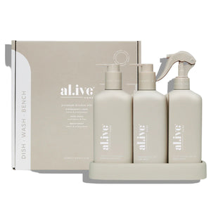 The al.ive body Dishwashing Liquid, Hand Wash & Bench Spray + Tray Premium Kitchen Trio is a beautiful yet practical product, elegantly packaged to elevate your countertop.