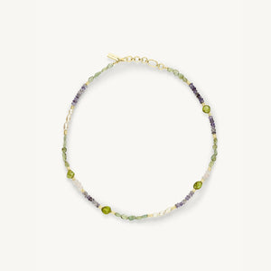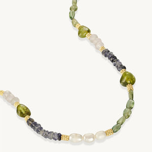 The Wren Beaded Necklace showcases a striking blend of Apatite, Iolite, Peridot, Rose Quartz and Pearl creating a harmony of greens and blues punctuated by softness.