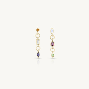 A bold celebration of colour, these asymmetric stunners feature a unique trio of hand-cut stones in each earring, from Moonstone, Rhodolite and Apatite, to Citrine, Blue Topaz and Iolite. Handmade with lightly hammered organic finishes and bezel settings, they’re the perfect statement pair to complete the Calypso collection.