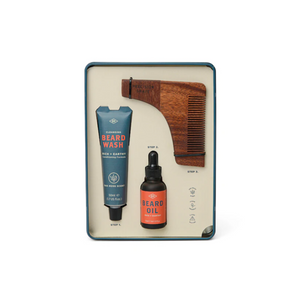 Packaged in a stylish reusable tin, this compact gift set contains a beard wash, beard oil and a unique angled wooden beard comb. Remove everyday dirt, smooth and detangle your beard before finishing with the nourishing beard oil.
