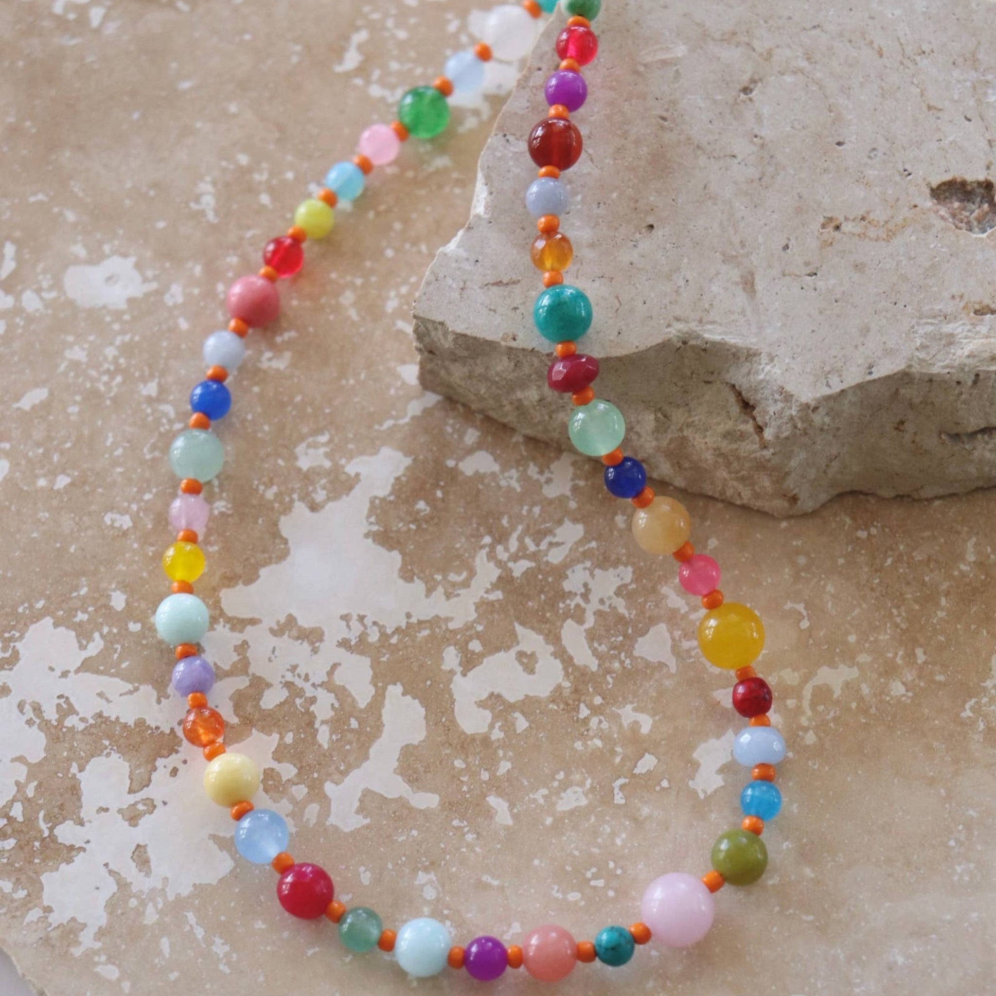 Roma's Holiday Stone Necklace - With Sun Charm My approach to what's hot in the world of semi precious stone jewellery and fashion is to gather all the stones into one strand of mixed size beads and stainless steel spacers, together with a statement oversized brilliant blazing sun charm, to bring you an elevated look that you can take to the streets (or feel great while you’re packing lunch boxes).