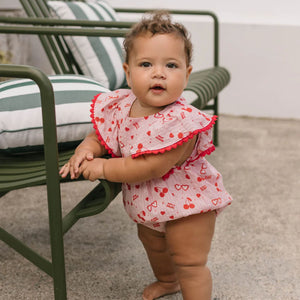 Meet your new summer staple, the Mon Cheri Romper. Crafted from lightweight cotton, it's perfect for sunny outings, playground giggles, or cozy nap times. The signature Mon Amour print, featuring cherries, hearts, and cheeky French phrases, adds personality, while the ruffled sleeves trimmed with red ric rac and a playful heart shaped back cutout elevate its charm.