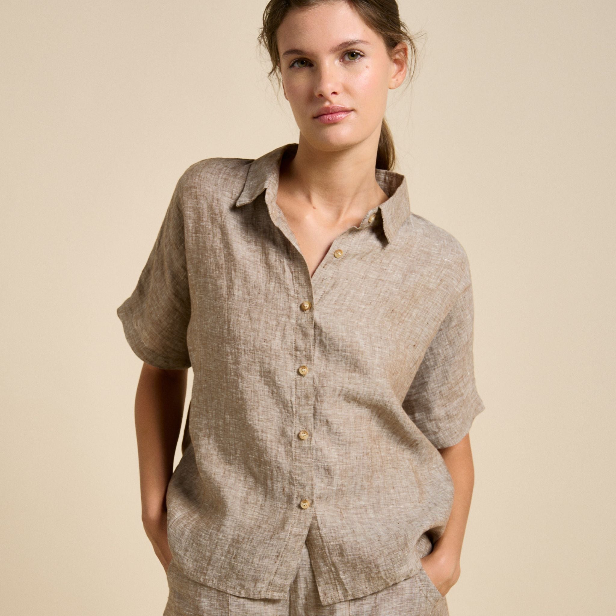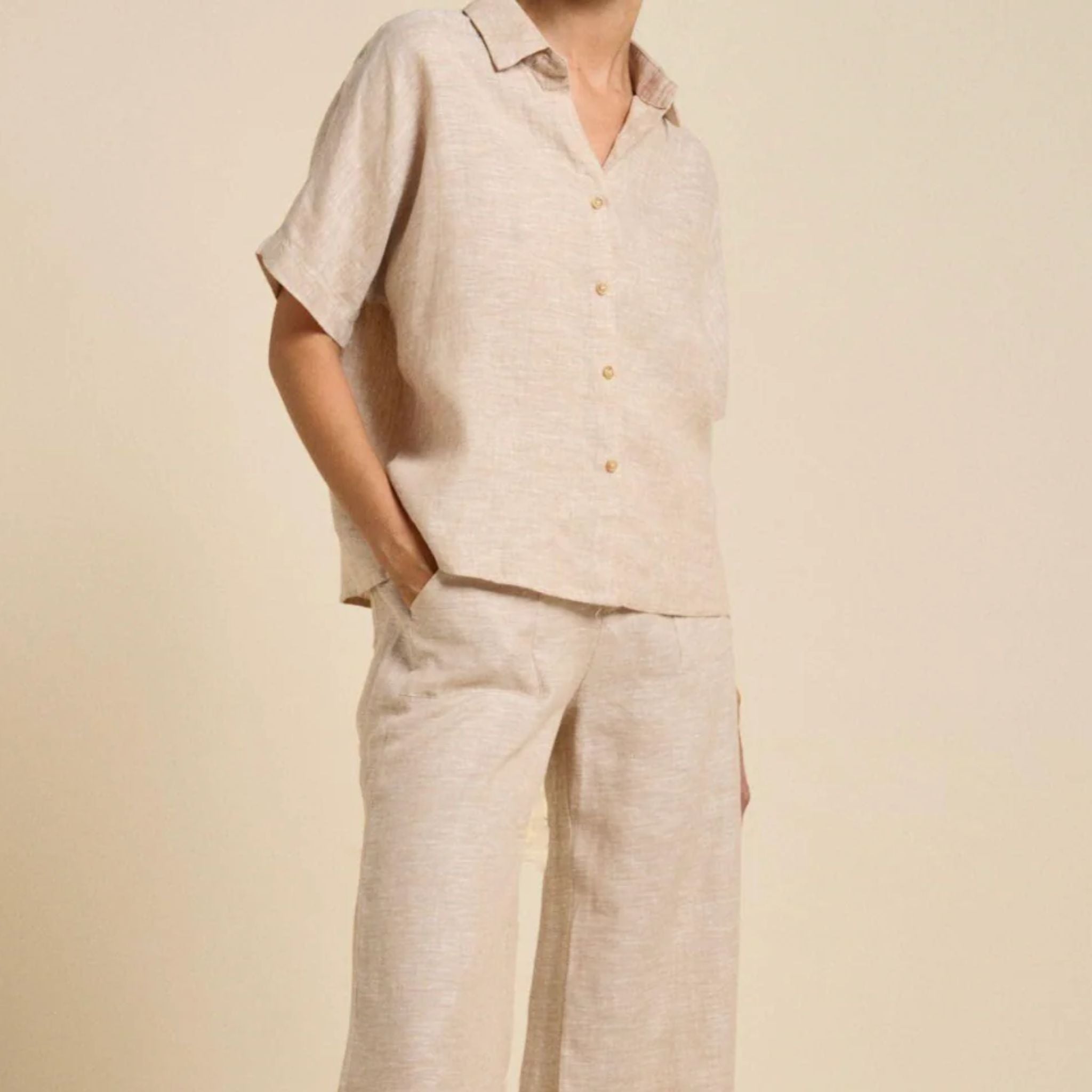 The Bondi Shirt combines comfort and style with its textured, slub like linen fabric. Designed for a relaxed fit, it features short sleeves, a classic collar, and functional front buttons for easy wear. Lightweight and breathable, this shirt offers effortless sophistication for any season. Small side splits and a straight hemline enhance its easygoing shape.